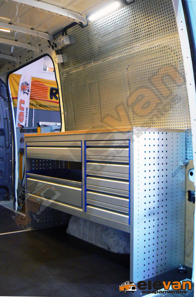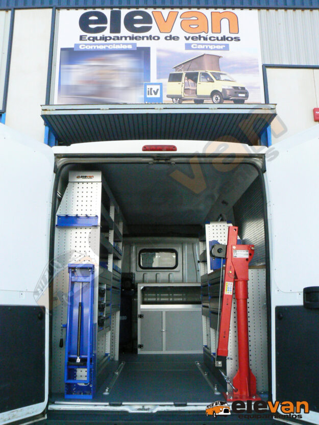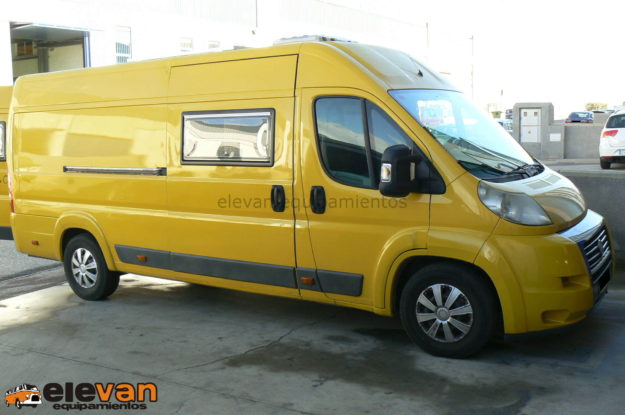 Camper de 4 plazas para circular y 2 para dormir. Mobiliario en contrachapado marino, mesa para uso interior y exterior. Batería auxiliar, iluminación leds, nevera, microondas, fregadero, ducha exterior, wc portátil, panel solar, techo elevable…